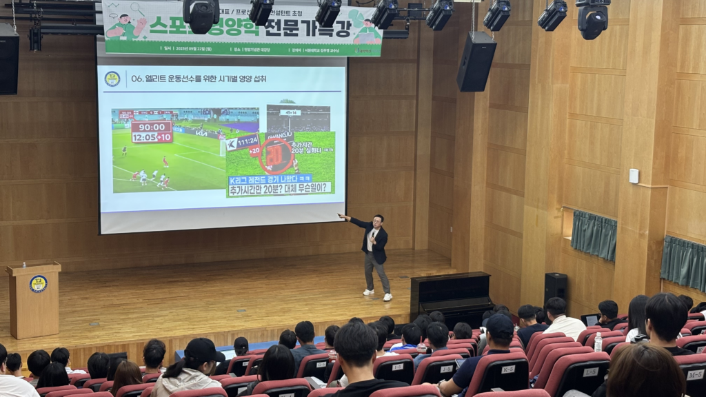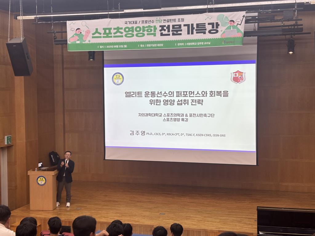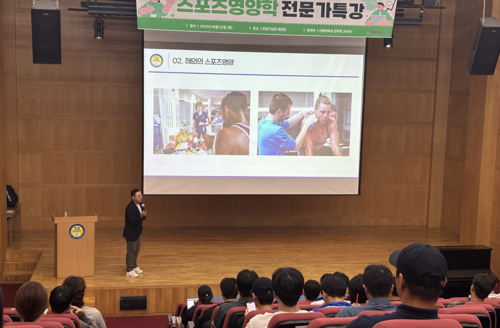 2025학년도 1학기 전문가 초청 특강에는 서원대학교 스포츠과학과 교수 김주영 박사님을 초청하여 ‘스포츠영양학’이라는 주제로 특강을 진행하였다.